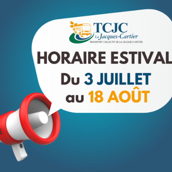 Dès le 3 juillet prochain, le Transport collectif de La Jacques-Cartier (TCJC) passe en mode estival. Du même coup, le TCJC offre un accès gratuit à l’ensemble de son réseau pendant tout l’été, soit pour les mois de juillet et d’août.