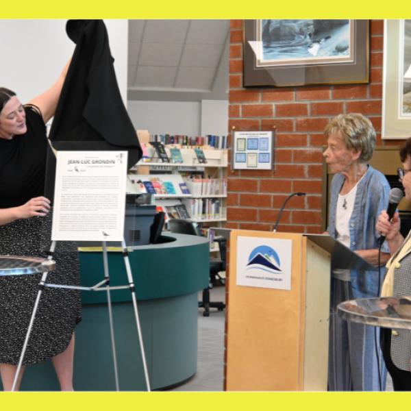 Après un moment très convivial passé autour de rafraichissements et de petites bouchées, les allocutions ont débuté. Madame Gaétane St-Laurent, conseillère du district 1 de la Municipalité, ancienne mairesse et responsable du comité Bibliothèque au moment de son inauguration en 1990, a pris la parole pour expliquer pourquoi le conseil municipal de l'époque avait décidé de donner le nom de du peintre à la toute nouvelle bibliothèque. Puis, la coordonnatrice de la bibliothèque, madame Evelyn Bouchard, a dévoilé la plaque commémorative que le service des Loisirs, de la culture et de la vie communautaire a fait produire en l'honneur de Jean-Luc Grondin. Cette plaque sera accrochée à la bibliothèque Jean-Luc-Grondin. Elle résume la vie passionnante de cet artiste au caractère si discret, mais reconnu mondialement pour la finesse et le réalisme de ses peintures d'oiseaux.
